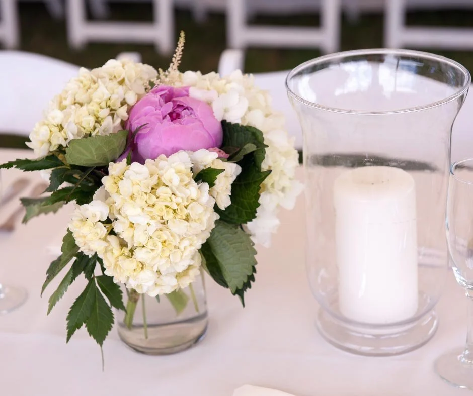 Fill clear glass vases (which can be thrifted or purchased in bulk) with water, and add floating candles along with a few petals of roses or peonies for a simple yet stunning centerpiece. For a rustic touch, wrap the vases in burlap or lace.